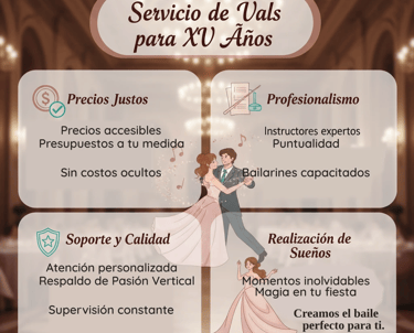 Vals - Bailes complementarios - Sonido - Mesa de dulces - Foto y vídeo - Maestro de ceremonias - Invitación digital QR - Pistola de confeti - Más opciones da click aquí